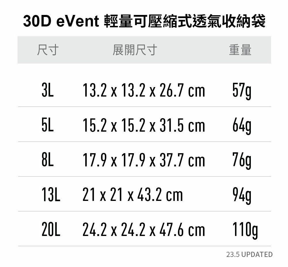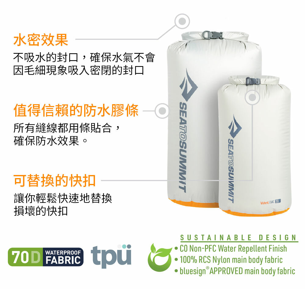 超輕量,不需要透氣閥、輕鬆將空氣擠壓出去確保裝備乾燥不進水。