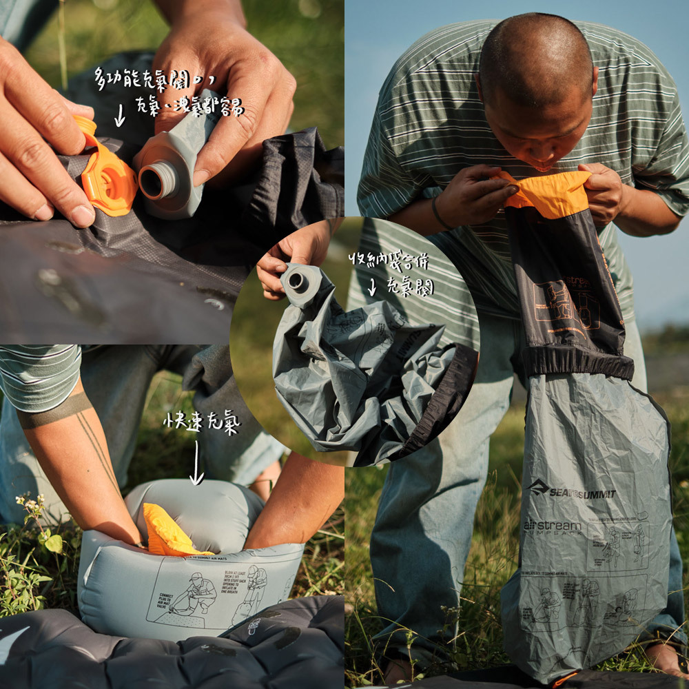 (專業提示:將睡墊充氣幫浦的充氣袋翻過來,即可看到一個尺寸與 Aeros 枕頭的 mini-XPRESS 氣閥完美搭配的噴嘴)