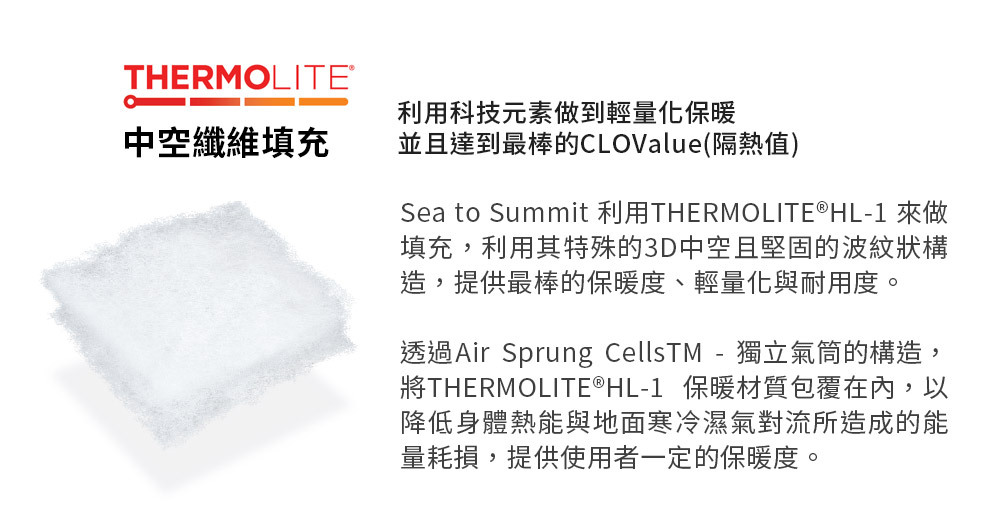 THERMOLITE®保暖布料,利用科技元素將布料做到輕量化,並且達到最棒的CLO Value(隔熱值)(註)。Sea to Summit利用THERMOLITE® HL-1來做填充,利用其特殊的3D中空且堅固的波紋狀構造,提供最棒的保暖度、輕量化與耐用度。透過Air Sprung Cells™-獨立氣筒的構造,將THERMOLITE® HL-1保暖材質包覆在內,以降低身體熱能與地面寒冷濕氣對流所造成的能量耗損,提供使用者一定的保暖度。(註:CLO Value是只在是溫21度C、相對溼度不超過50%、空氣流速不超過10cms的條件下,一個人靜坐保持舒適狀態時衣服所需要的隔熱值。)