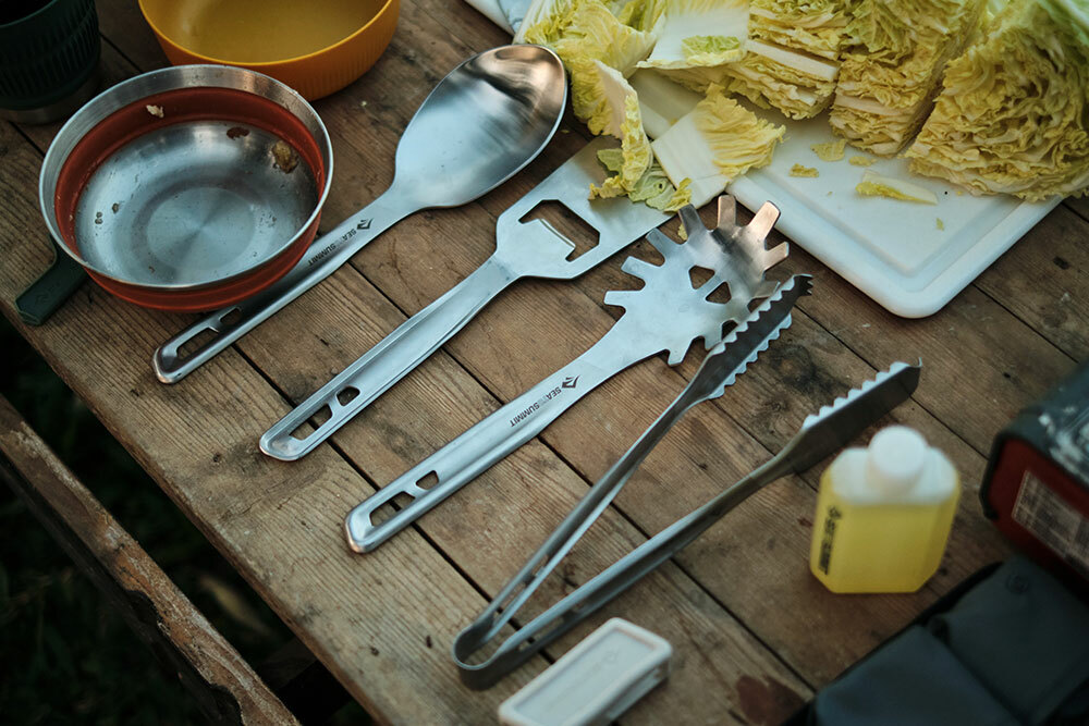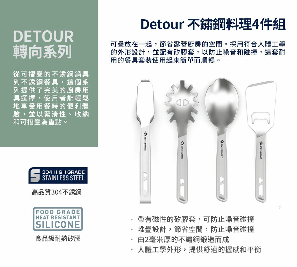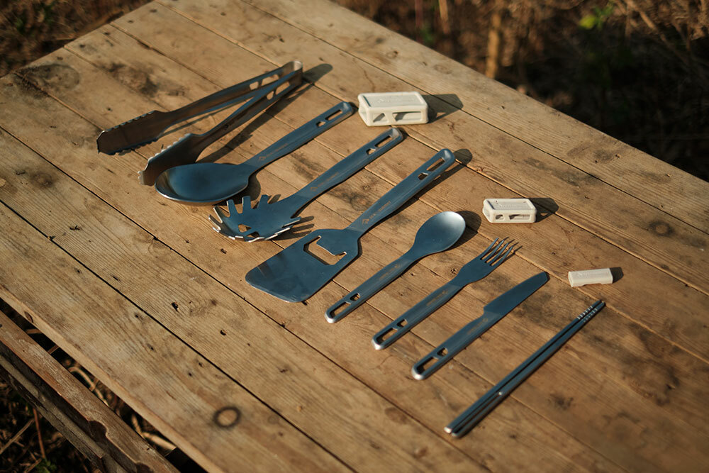可疊放在一起,節省露營廚房的空間。採用符合人體工學的外形設計,並配有矽膠套,以防止噪音和碰撞,這套耐用的餐具套裝使用起來簡單而順暢。