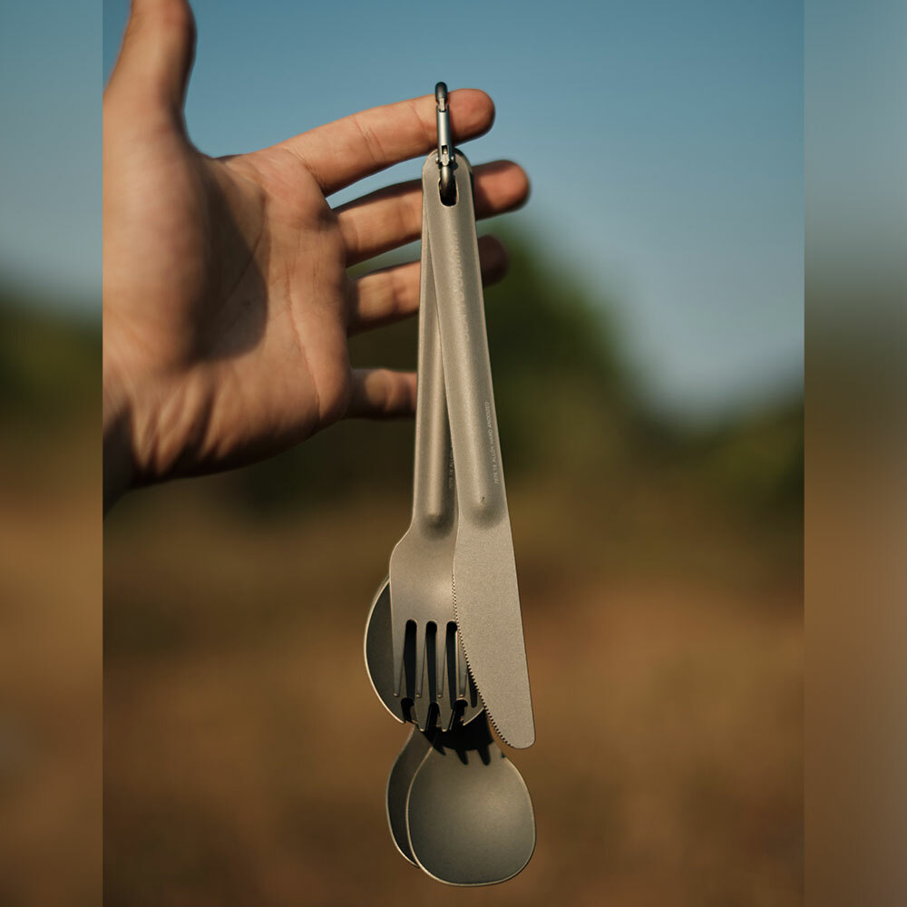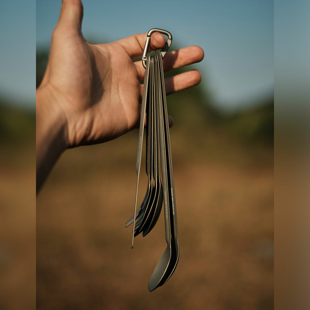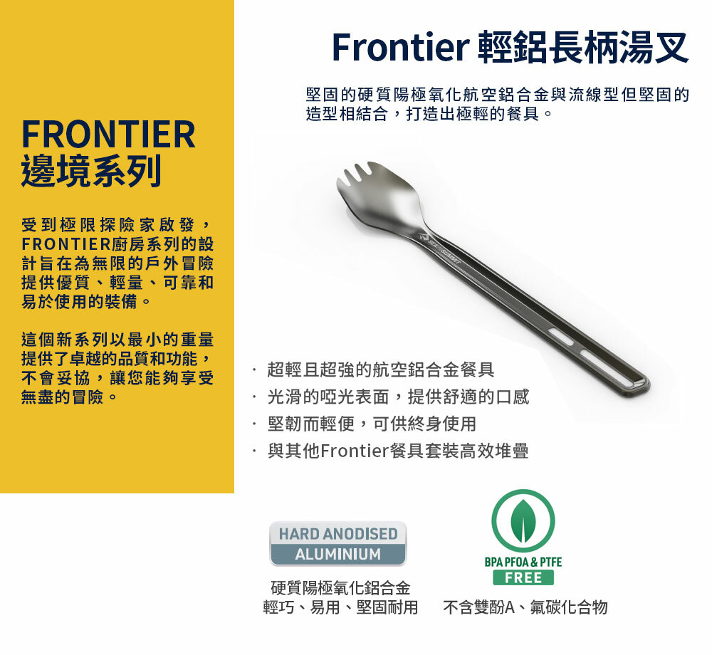堅固的硬質陽極氧化航空鋁合金與流線型但堅固的造型相結合,打造出極輕的餐具。這種硬化的外殼還封裝了鋁,消除了合金溶解到食物中的風險,並為舒適的用餐提供了光滑的表面質感。所有Frontier餐具套裝都附有一個鉤環,可以將餐具整齊地固定在一起,方便存放。(單支未附鉤環)