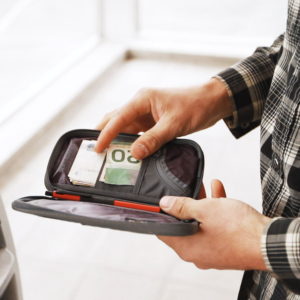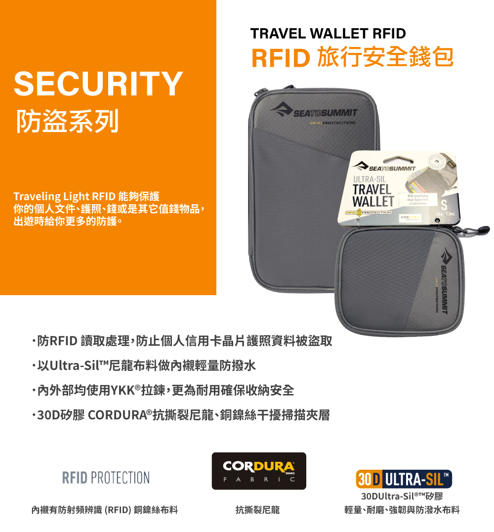 RFID 防盜裝置可防止個人電子資料被盜取,旅遊時能更加安心。Sea to Summit 的RFID 安全防護系列商品均使用了防護布料,有效發揮屏蔽效果來阻擋無線訊號的收發,降低信用卡、金融卡等重要證件資料被竊取的機率,避免個人資訊受到外洩的風險。