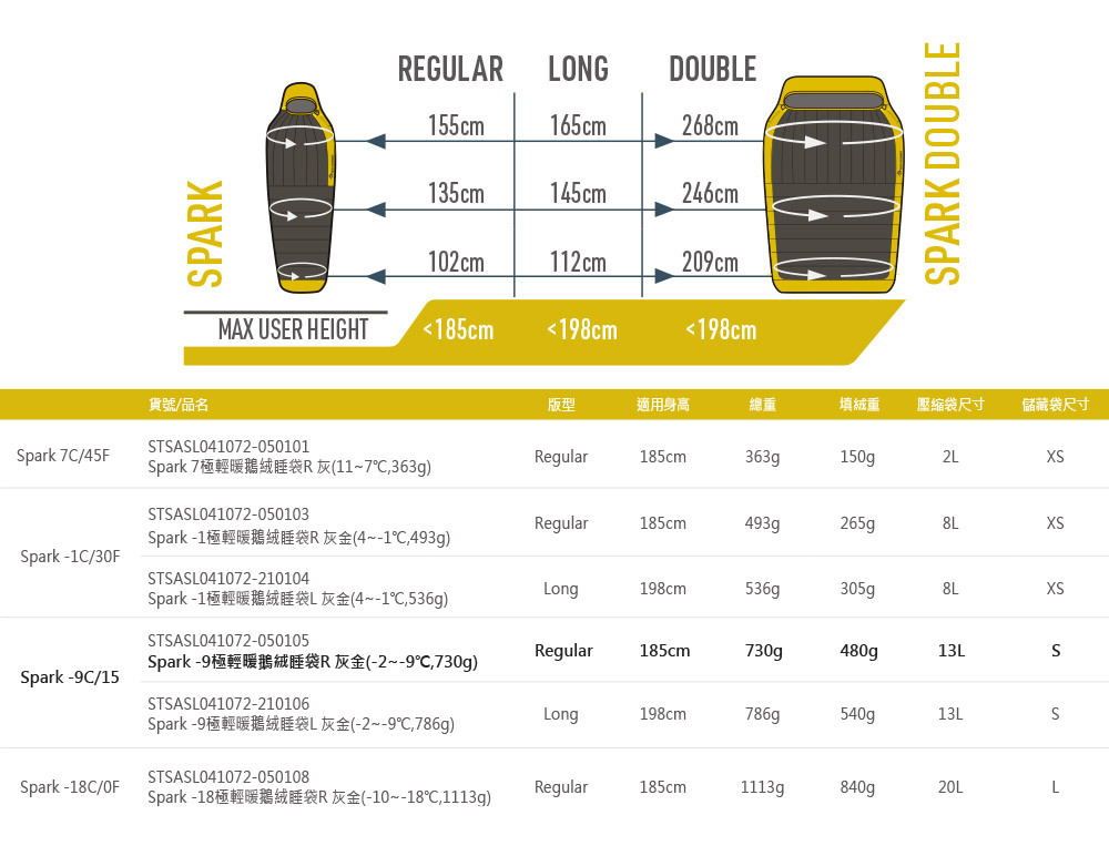 Sea to Summit Spark -9 極輕暖鵝絨睡袋R 灰金(-2~-9℃,730g)